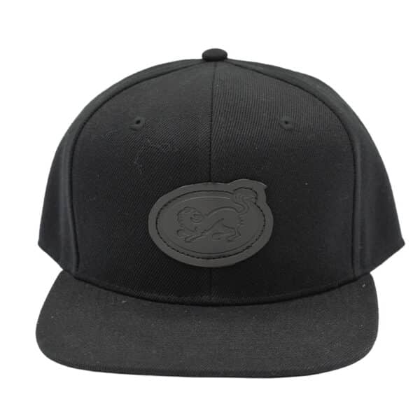 Musta Oulun Kärppien lippis, jossa Kärppälogo ovaalilla on painettu nahkamerkillä lippiksen etuosaan.